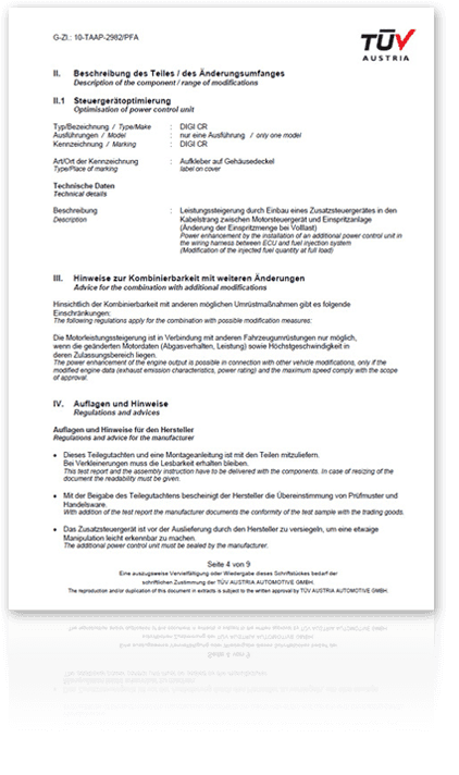 Leistungssteigerungen sind in Deutschland und Österreich eintragungspflichtig. RaceChip bietet für RS und S optional ein TÜV Teilegutachten an, das bei der Eintragung vorgelegt werden kann.